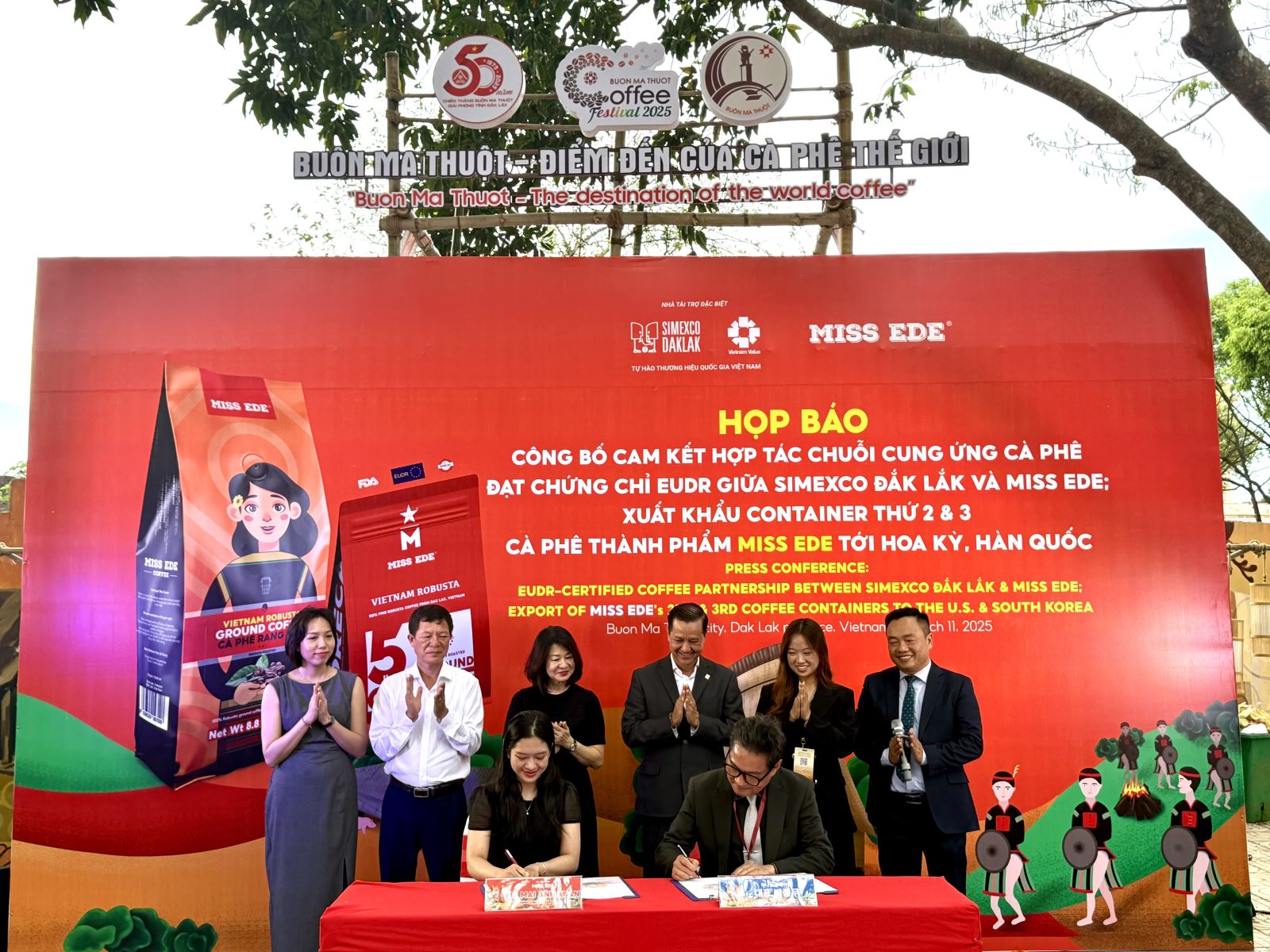 Chiều 11/3, trong khuôn khổ Lễ hội Cà phê Buôn Ma Thuột lần thứ 9 năm 2025, Công ty TNHH TMDV Nông trại EDE (MISS EDE) và Công ty TNHH MTV xuất nhập khẩu 2-9 Đắk Lắk (Simexco Daklak) tổ chức ký cam kết hợp tác lâu dài về chuỗi cung ứng cà phê xuất khẩu đạt chứng chỉ không xâm lấn rừng tự nhiên của Liên minh châu Âu (EUDR).