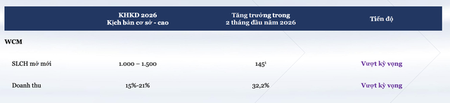 Trong 2 tháng đầu năm 2026, WinCommerce ghi nhận tổng doanh thu đạt 7.872 tỷ đồng, tăng 32,2% so với cùng kỳ, vượt kế hoạch tăng trưởng doanh thu năm 2026 từ 15% đến 21%. Trong đó, doanh thu nhóm cửa hàng được mở trước và trong năm 2024 và hiện đang hoạt động tiếp tục tăng trưởng 16,7%.