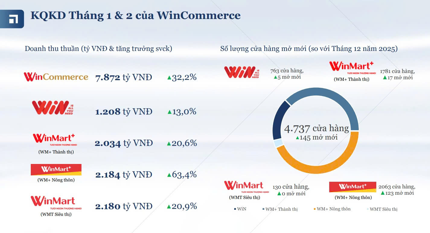 Tính tới cuối tháng 2/2026, WinCommerce đã mở mới 145 cửa hàng, nâng tổng số cửa hàng lên 4.737 cửa hàng. Trong đó, chuỗi WinMart+ ở nông thôn mở mới 123 cửa hàng; chuỗi WinMart+ ở thành thị mở 17 cửa hàng, lên 1.781 cửa hàng; chuỗi WiN mở mới 5 cửa hàng mới, lên 763 cửa hàng; chuỗi WinMart (siêu thị) duy trì 130 cửa hàng.