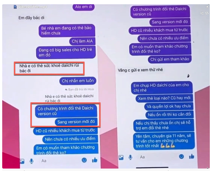 Trong đó, nội dung đáng chú ý là “đổi thẻ” cũ của Dai ichi, và Manulife, để lấy thẻ phiên bản mới bên AIA. Lý do được đưa ra là hợp đồng cũ, mua từ trước chưa có nhiều ưu điểm, nên trao đổi với khách hàng rằng, nếu ổn rồi thì không cần đổi, còn chưa ổn sẽ hỗ trợ đổi thẻ mới. Vị này cũng chia sẻ chiến lược, mình đi “câu” thì phải vừa đẩy, vừa hút.