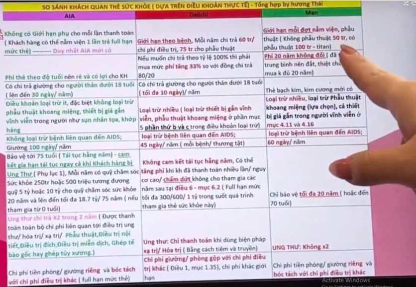 Sau đó, vị này có chia sẻ đến bước tiếp theo là so sánh thẻ, lưu ý tuyệt đối không được tham, đọc hợp đồng Manulife cho khách hàng, so sánh đúng 3 triệu thẻ không tích luỹ hàng năm và nói rõ cho khách hàng khoản phí thẻ này sẽ mất đi, dù có mua ở AIA hay Manulife.