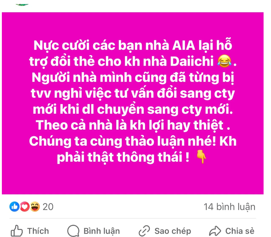 Cụ thể, một tư vấn viên tên H.Nguyễn thắc mắc, các bạn nhà AIA lại hỗ trợ đổi thẻ cho khách hàng Dai ichi, và đặt câu hỏi: Trường hợp này khách hàng có lợi hay thiệt?