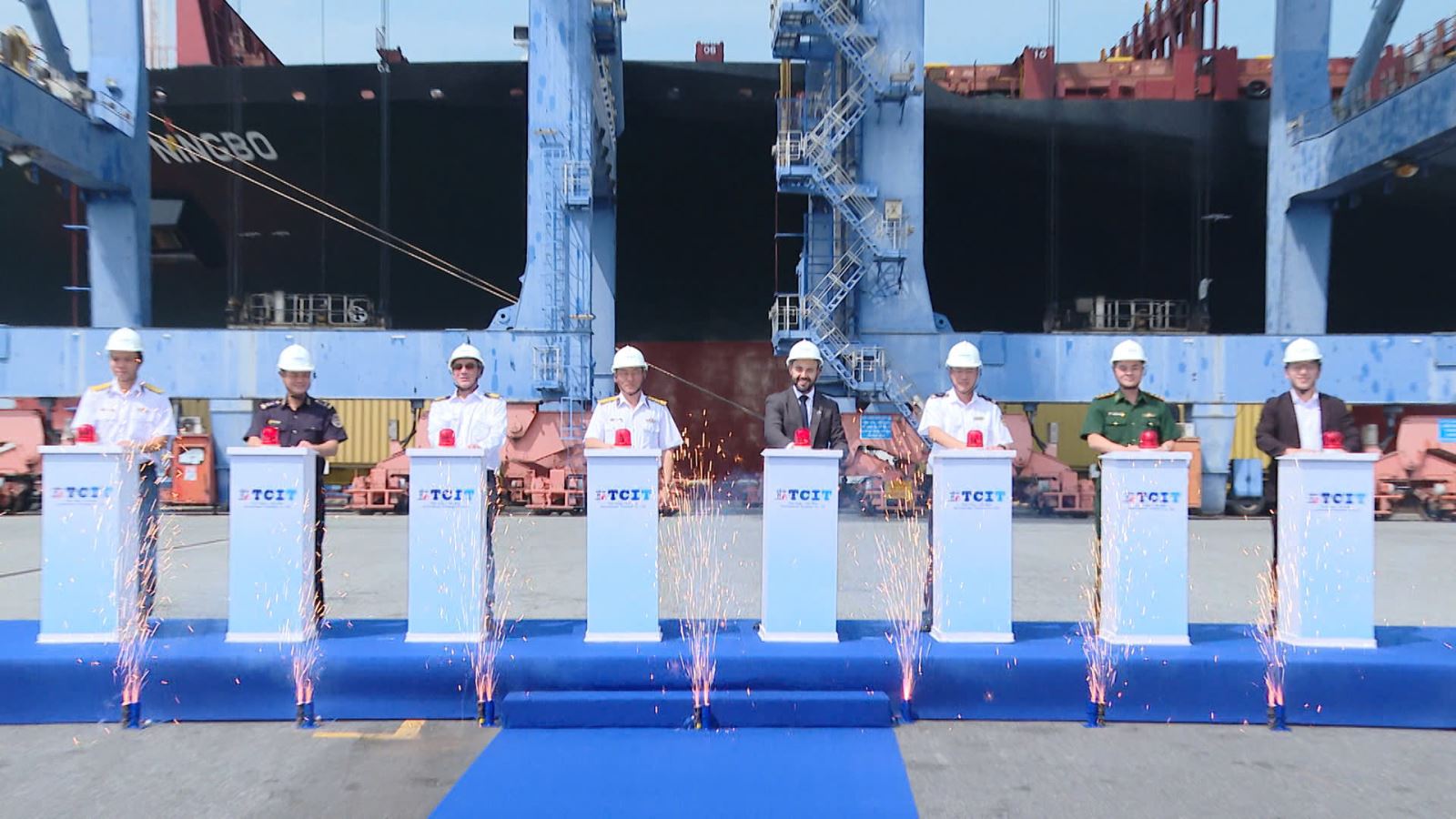 Đại diện lãnh đạo Tổng Công ty Tân cảng Sài Gòn, hãng tàu ZIM và các cơ quan chức năng phát lệnh chào mừng chuyến tàu đầu tiên của tuyến ZSL/PELICAN cập cảng TCIT.