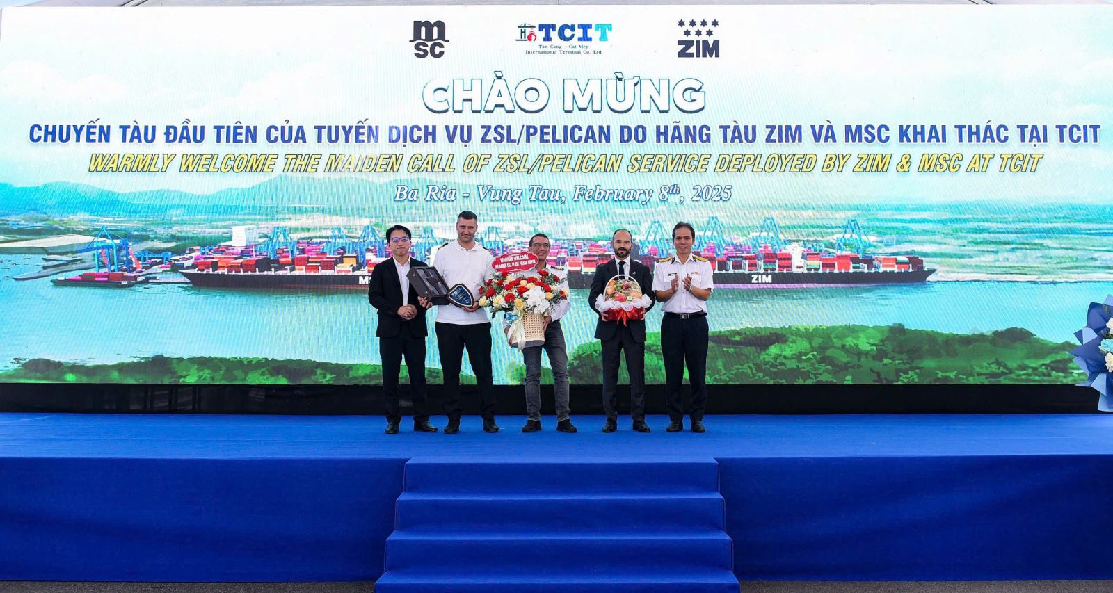 Sáng 8/2, Cảng Quốc tế Tân Cảng - Cái Mép (TCIT) đón tàu NINGBO, chuyến tàu đầu tiên trong tuyến dịch vụ ZSL/PELICAN do các hãng tàu ZIM và MSC khai thác.