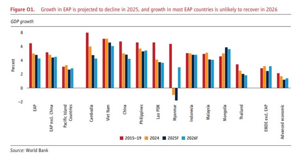 WB dự kiến tăng trưởng GDP của Việt Nam chậm lại còn 6,1% năm 2026, sau đó phục hồi lên 6,5% năm 2027, nhờ việc thương mại toàn cầu hồi phục và Việt Nam tiếp tục là điểm đến hấp dẫn dưới vai trò là một trung tâm công nghiệp cạnh tranh trong chuỗi cung ứng toàn cầu.