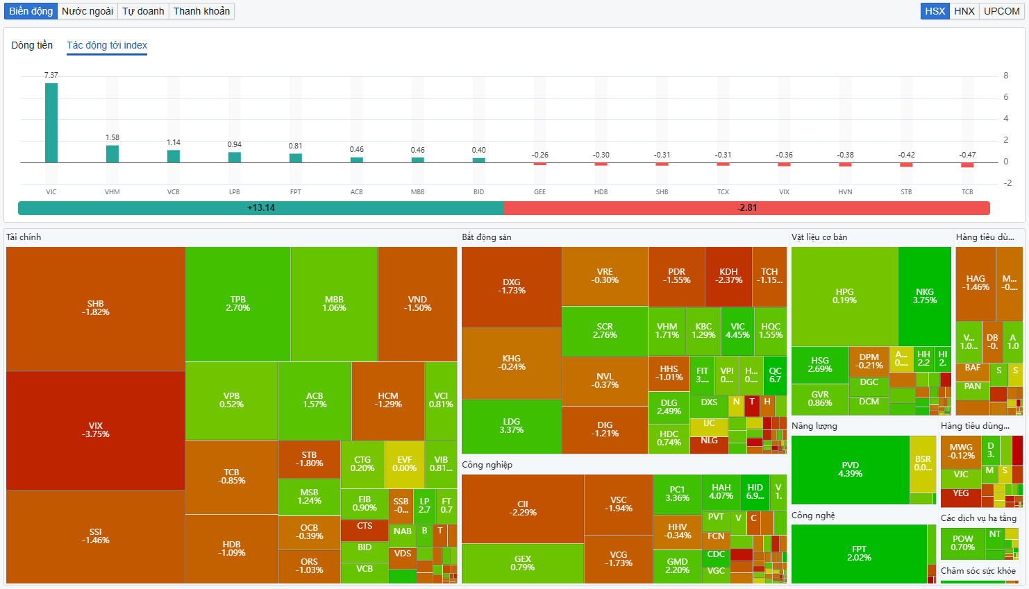 Nhóm dầu khí cũng ghi nhận nhiều mã tăng như PVD (tăng 4,39%), PTV (tăng 2,63%); các mã PLX, PVS, PVB, PVC tăng nhẹ. Hầu hết các nhóm cổ phiếu còn lại phân hóa, sắc xanh và đỏ đan xen.