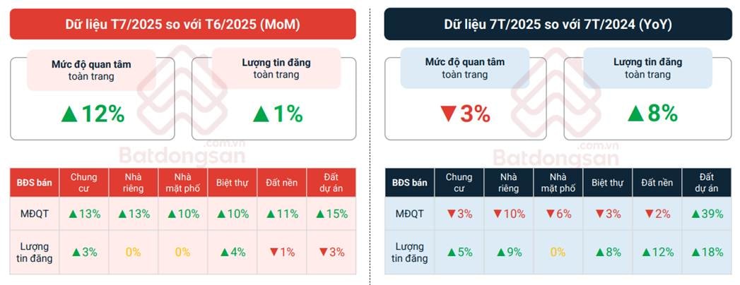 Dữ liệu tháng 7/2025 của Batdongsan.com.vn ghi nhận mức độ quan tâm đồng loạt tăng ở hầu hết các khu vực trên cả nước. Hai thị trường trọng điểm là Hà Nội và TP.HCM cũ đều tăng 11% về mức độ quan tâm so với tháng trước.