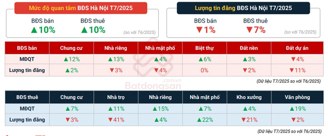 Mức độ quan tâm BĐS bán và cho thuê tại Hà Nội vào tháng 7/2025 đều tăng 10% so với tháng 6/2025.
