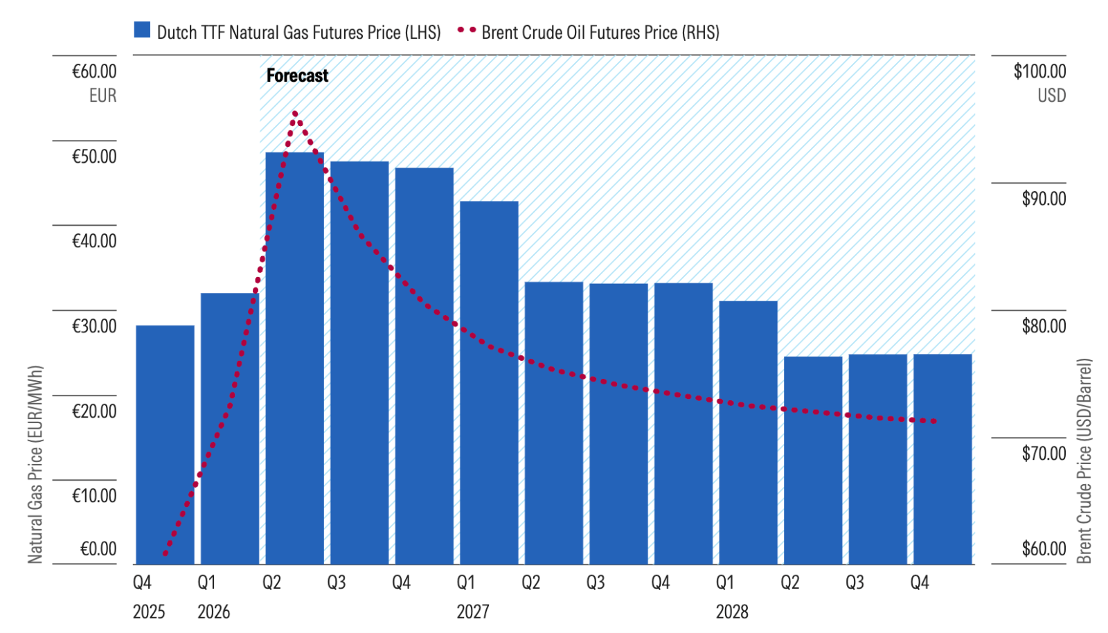 Thị trường tương lai dự đoán giá năng lượng sẽ đạt đỉnh vào giữa năm 2026. Nguồn: Bloomberg. Dữ liệu tính đến ngày 13/3/2026