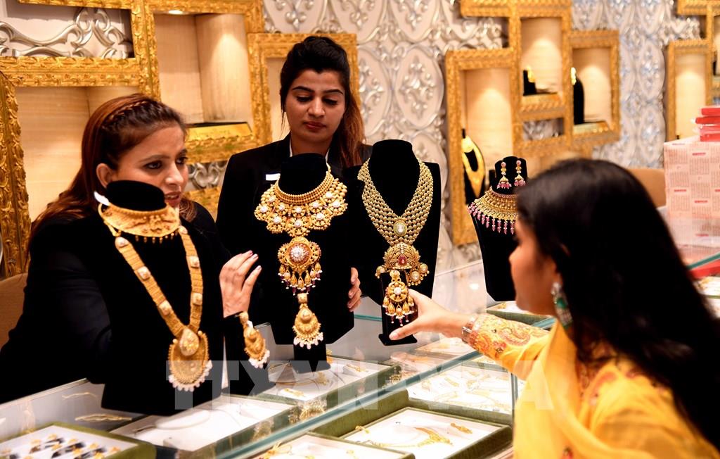 Người dân mua vàng trang sức tại cửa hàng ở Bhopal, Ấn Độ. Ảnh: THX/TTXVN