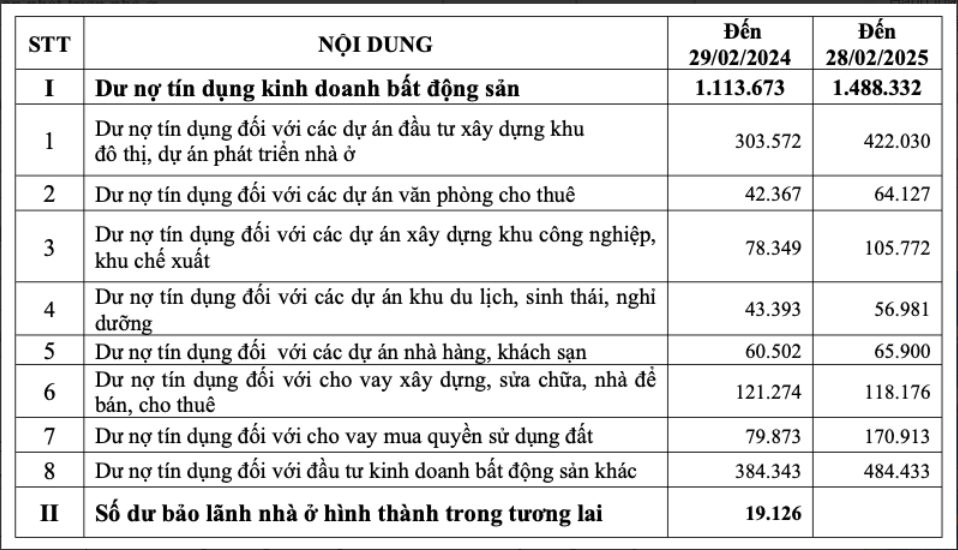 Báo cáo mới nhất của Bộ Xây dựng về thị trường bất động sản quý I/2025 cho thấy dư nợ tín dụng kinh doanh bất động sản đạt mức 1.488.332 tỷ đồng, tăng 25% so với cùng kỳ năm ngoái và tăng nhẹ 2% so với cuối năm 2024.