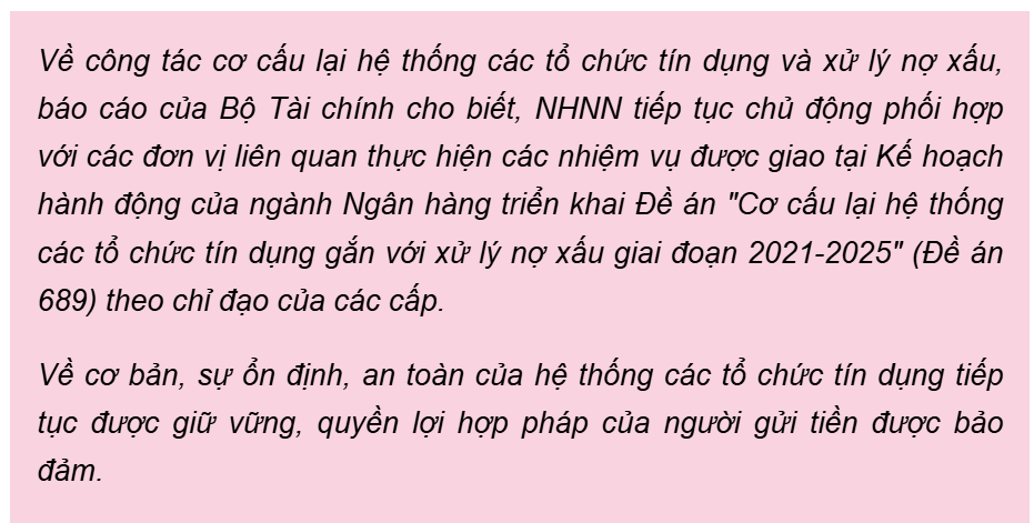 Theo báo cáo, các giải pháp tín dụng đối với ngành, lĩnh vực được triển khai tích cực, đồng bộ nhằm hướng tín dụng vào các lĩnh vực sản xuất kinh doanh, các lĩnh vực ưu tiên, các động lực tăng trưởng theo chỉ đạo của Chính phủ, Thủ tướng Chính phủ; tăng khả năng tiếp cận vốn tín dụng ngân hàng, góp phần hỗ trợ thúc đẩy tăng trưởng kinh tế.