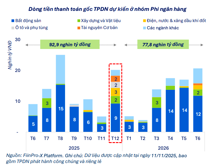 Nghĩa vụ lãi trong tháng 12 dự báo tăng mạnh, đạt khoảng 7,6 nghìn tỷ đồng và là mức cao nhất trong năm. Bất động sản tiếp tục dẫn đầu về quy mô lãi đến hạn, trong khi các ngành còn lại có áp lực thấp hơn nhưng vẫn duy trì xu hướng tăng. Tổng nghĩa vụ lãi của 2 tháng cuối năm ước đạt 13,4 nghìn tỷ đồng, một lần nữa cho thấy gánh nặng tài chính đáng kể của nhiều doanh nghiệp phi ngân hàng.