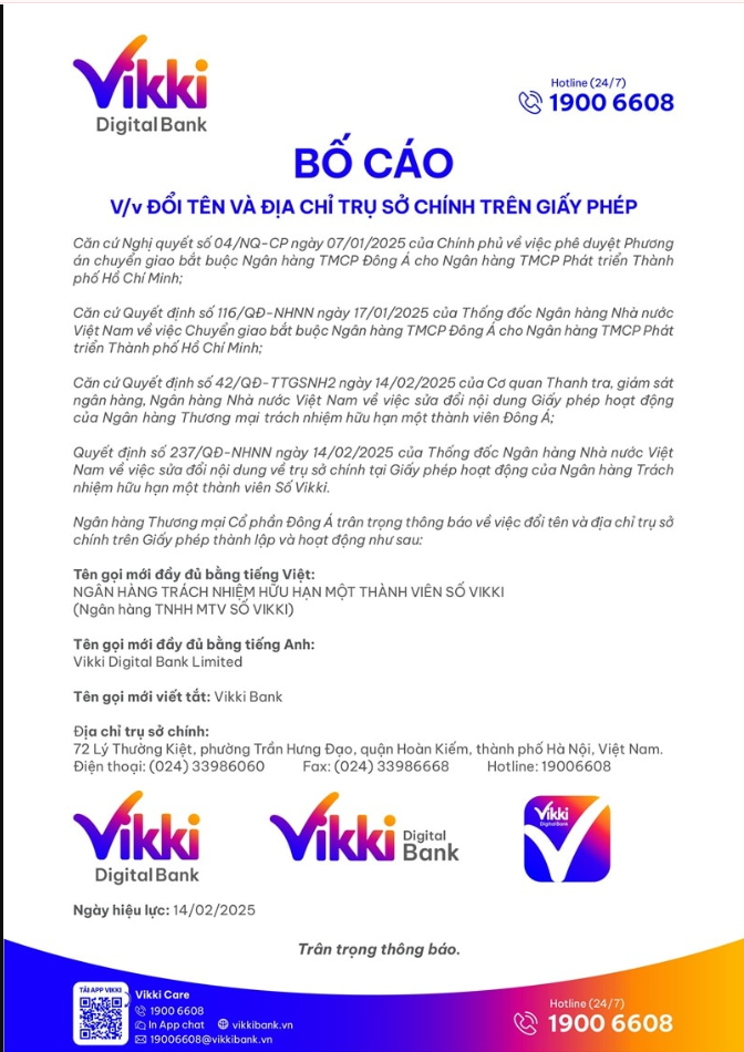 Ngân hàng TNHH một thành viên Đông Á đổi tên thành Ngân hàng Số Vikki theo quyết định số 42/QĐ-TTGSNH2 ngày 14/02/2025 của Ngân hàng Nhà nước Việt Nam.