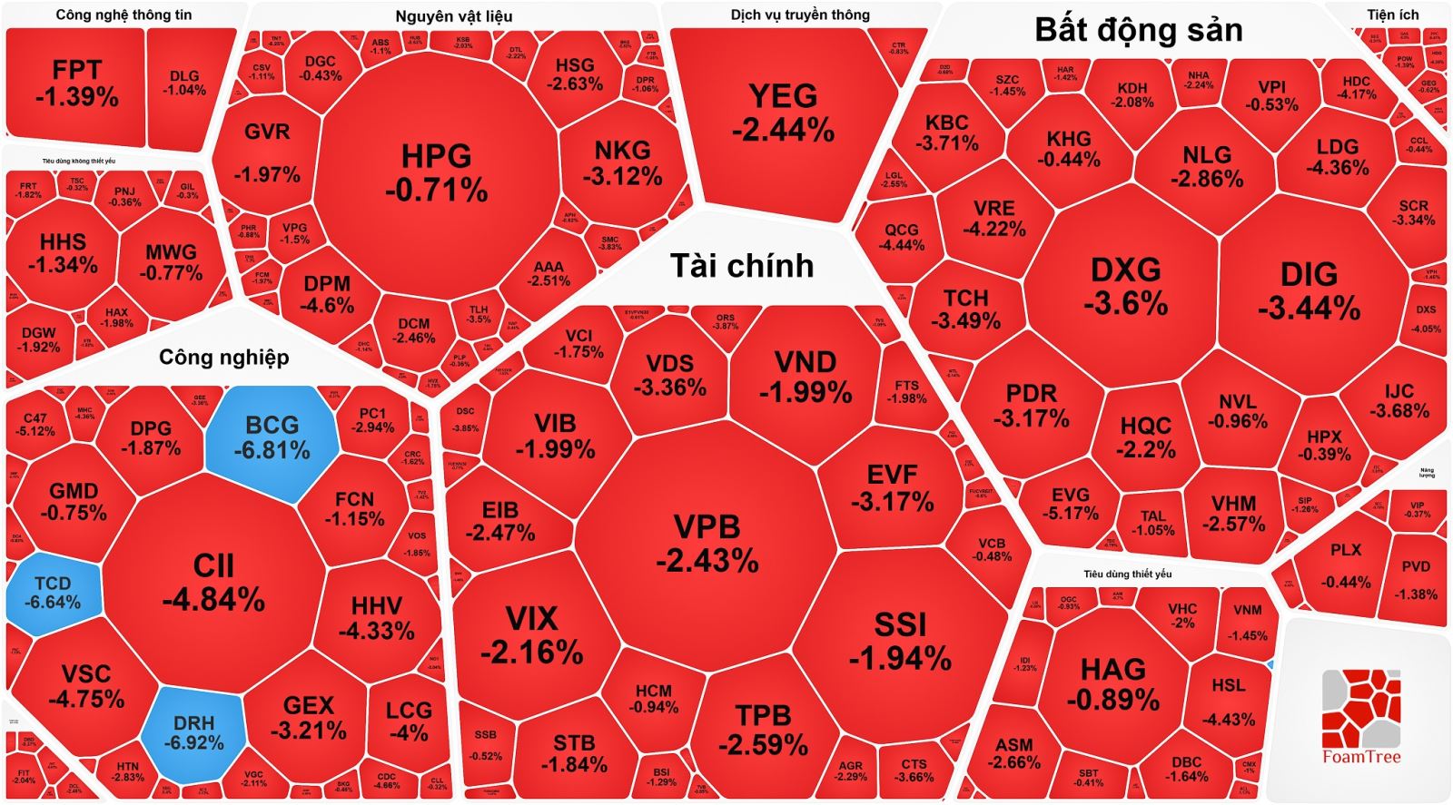 Ở chiều ngược lại, nhóm công nghiệp cũng chìm trong sắc đỏ với các mã giảm mạnh: CII (-4,84%), GEX (-3,21%), HHV (-4,33%), VSC (-4,75%). Đây cũng là nhóm bị khối ngoại bán ròng mạnh, góp phần làm gia tăng áp lực giảm giá.