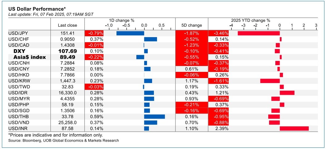 Dữ liệu của UOB chỉ ra, hầu hết các đồng tiền châu Á đã có một khởi đầu tích cực trong năm 2025, khi các biện pháp thuế quan ngay từ ngày đầu nhậm chức của Tổng thống Trump đối với Trung Quốc – vốn bị lo ngại từ trước – đã không xảy ra. Ngay cả khi ông Trump cuối cùng công bố mức thuế 10% đối với hàng hóa Trung Quốc vào ngày 1/2, phản ứng ôn hòa của Trung Quốc so với Canada và Mexico cho thấy tuyến đầu của cuộc chiến thương mại mới có thể là với các nước láng giềng của Mỹ, một điểm khác biệt quan trọng so với cuộc chiến thương mại Mỹ - Trung năm 2018.