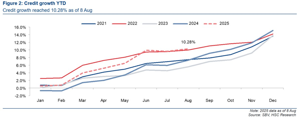 Tính đến ngày 08/08/2025, tăng trưởng tín dụng đạt 10,3%, bám sát và phù hợp với mục tiêu 16% cả năm mà Chính phủ đề ra. Lịch sử cho thấy, các giai đoạn mở rộng tín dụng mạnh mẽ thường đi cùng với tăng trưởng GDP cao, hoạt động đầu tư sôi động và thanh khoản TTCK dồi dào. Do đó, nếu Chính phủ kiên quyết theo đuổi mục tiêu tăng trưởng GDP 2 con số, việc mở rộng tín dụng sẽ tiếp tục là trọng tâm, và TTCK sẽ có nhiều cơ hội để hoạt động tốt.