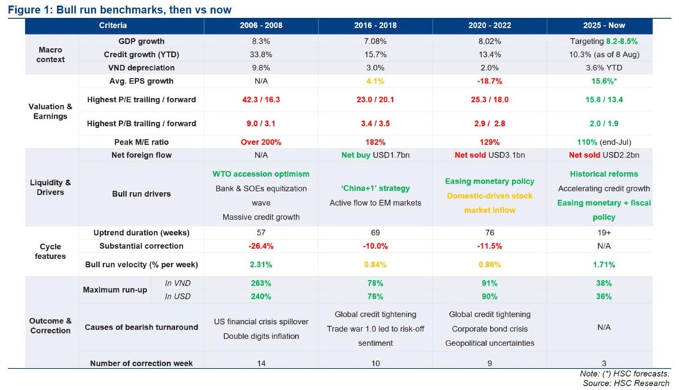 Dựa trên các dữ liệu, mặc dù TTCK có thể đối diện với những đợt điều chỉnh kỹ thuật tiềm năng, nhưng khả năng cao cũng sẽ còn những đợt tăng giá mạnh mẽ tiếp theo. Khác với các chu kỳ trước, đợt tăng giá hiện tại được củng cố bởi các yếu tố cơ bản vĩ mô vững chắc hơn, mở rộng tín dụng mạnh mẽ và lợi nhuận doanh nghiệp tăng trưởng ổn định, khiến đây không chỉ là sự tiếp nối câu chuyện tăng trưởng của Việt Nam mà còn là chu kỳ tăng trưởng bền vững nhất trong 20 năm qua. Thị trường Việt Nam khi bước vào uptrend, luôn có xu hướng vượt quá giá trị hợp lý và đợt tăng giá hiện tại có thể cũng không ngoại lệ.