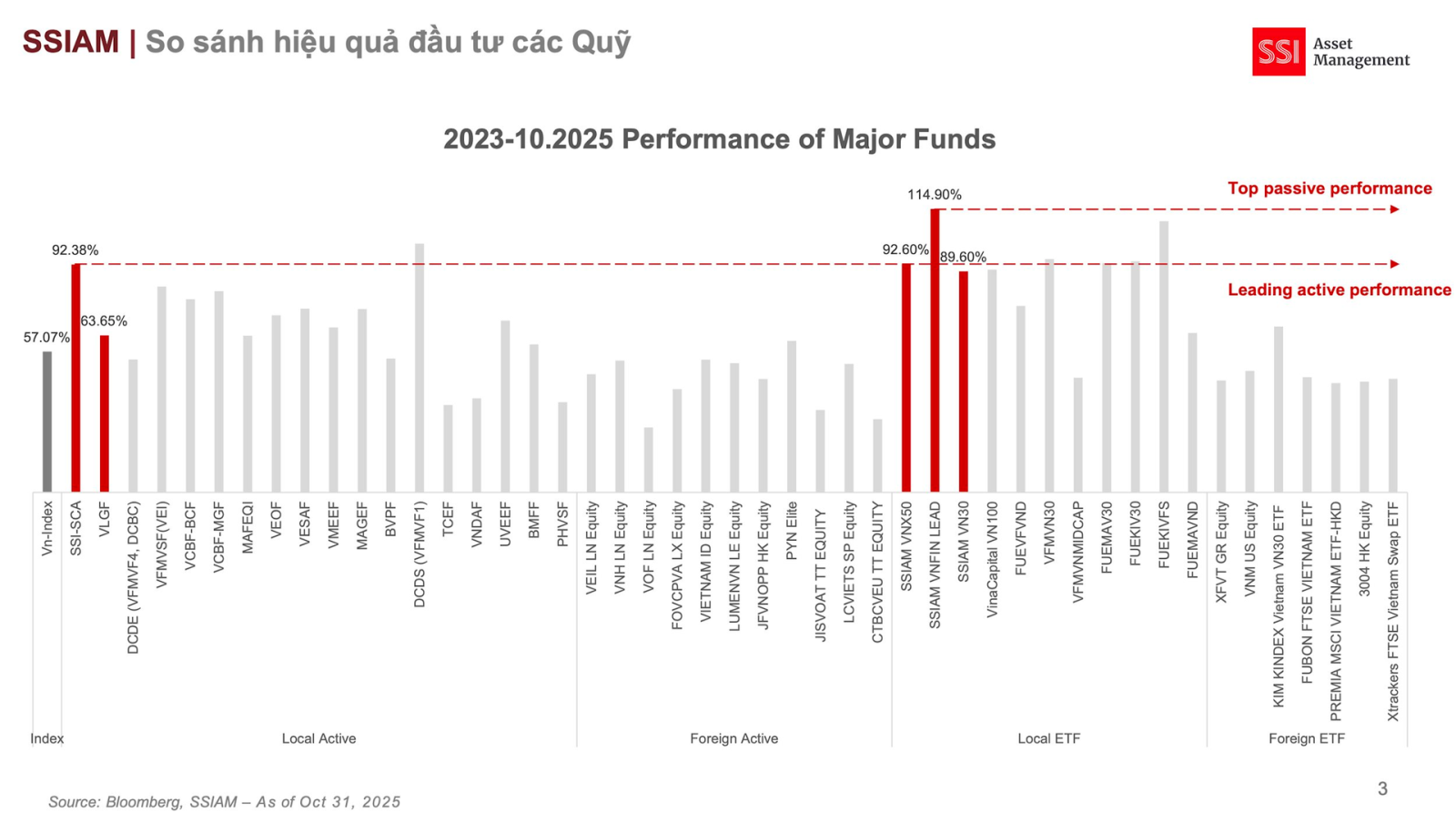 Từ đầu năm 2025, quỹ đạt hiệu suất ấn tượng gần 38%. Hiệu suất tính trong 3 năm trở lại đây lên đến 115%, vượt trội so với các quỹ thụ động khác trên thị trường. Với hiệu suất nổi bật, ETF VNFINLEAD thu hút sự quan tâm mạnh mẽ từ nhà đầu tư ngoại, khẳng định chất lượng sản phẩm “made by SSI”.