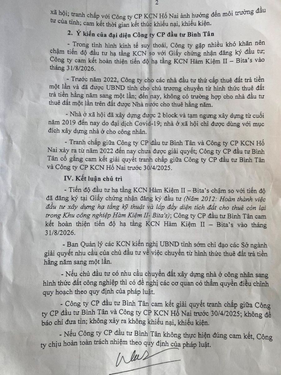 Cụ thể: Công ty Bình Tân đã không thực hiện cam kết trong Hợp đồng là giữ nguyên hiện trạng khi ngày 16/1/2024 ký hợp đồng cho 5 DN thuê lại đất trong KCN Hàm Kiệm II - Bita's bằng hình thức cho thuê đất trả tiền một lần và đã nhận toàn bộ tiền cho thuê đất. Không những vậy, HĐQT Công ty Bình Tân còn tự ý ra nghị quyết bãi nhiệm chức vụ Chủ tịch HĐQT của ông Huỳnh Đức Tấn (người được Công ty Hố Nai cử sang điều hành công ty) và bầu bà Lai Kim làm Chủ tịch HĐQT mới.