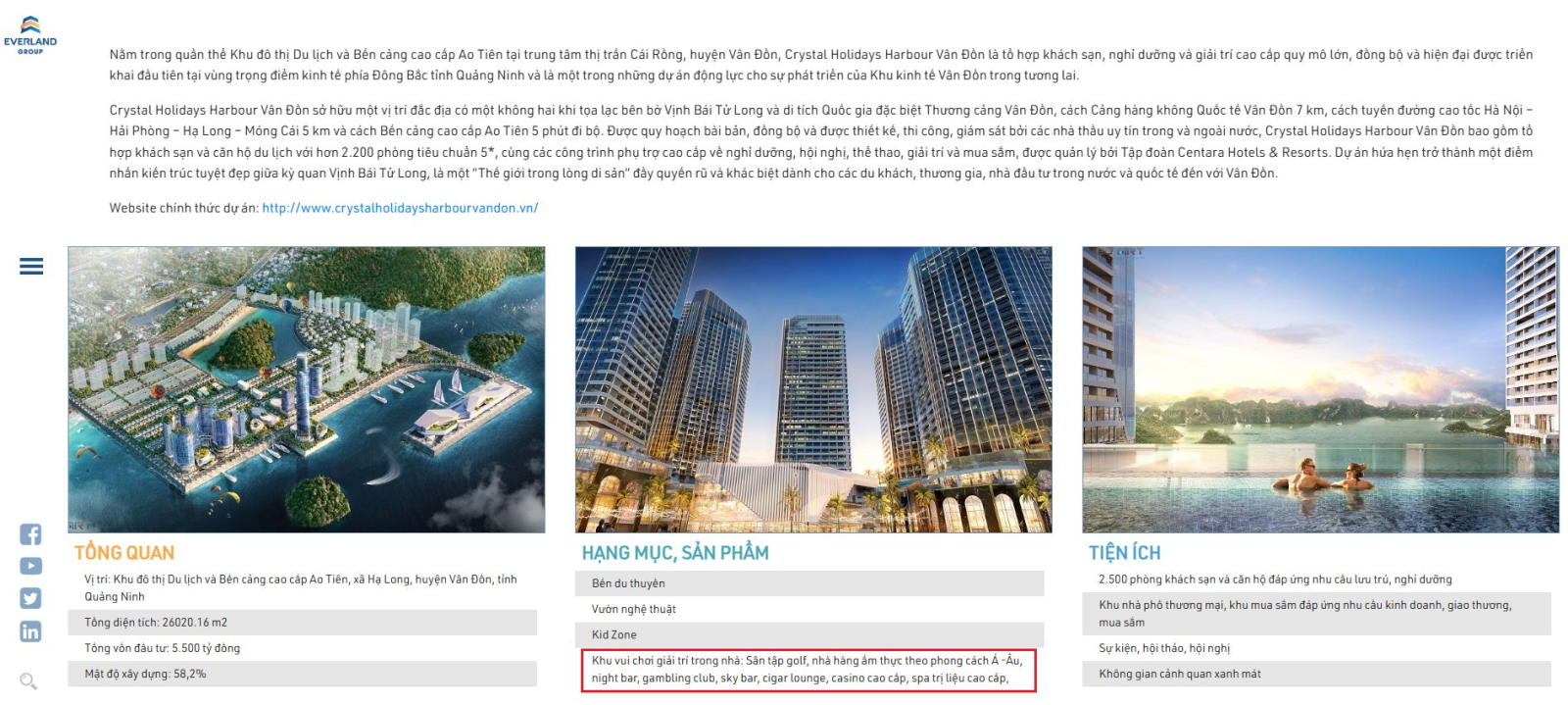 Theo thông tin được đăng tải trên website của chính mình, dự án Crystal Holidays Harbour Vân Đồn của Everland có hạng mục gồm casino.