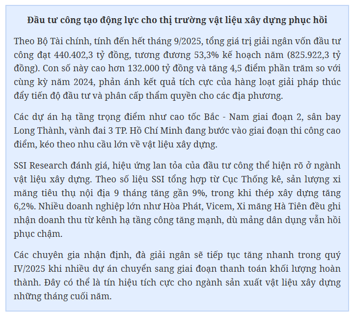 Theo TS. Thái Duy Sâm, thông thường những tháng cuối năm các dự án sẽ đẩy mạnh thi công để hoàn thành tiến độ và giải ngân, do đó thị trường thép và xi măng cuối năm 2025 dự kiến sẽ sôi động hơn, có thể làm tăng giá do nhu cầu từ đầu tư công và phục hồi từ thị trường bất động sản. Tuy nhiên, giá thép và xi măng đã tăng trong quý III, nên cuối năm 2025 có thể biến động trong biên độ vừa phải do nguồn cung dồi dào và còn phụ thuộc vào biến động chính sách tiền tệ, nhu cầu đầu tư công và chi phí đầu vào năng lượng, logistics.
