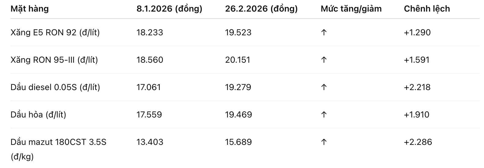 Bảng so sánh giá các mặt hàng xăng dầu giữa ngày 8.1.2026 và 26.2.2026. Thiết kế: Tuyết Lan