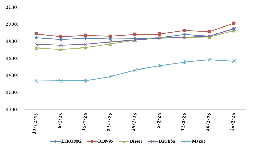 Biến động giá bán xăng dầu trong nước năm 2026 (31.12.2025 đến 26.2.2026). Nguồn số liệu: Bộ Công Thương