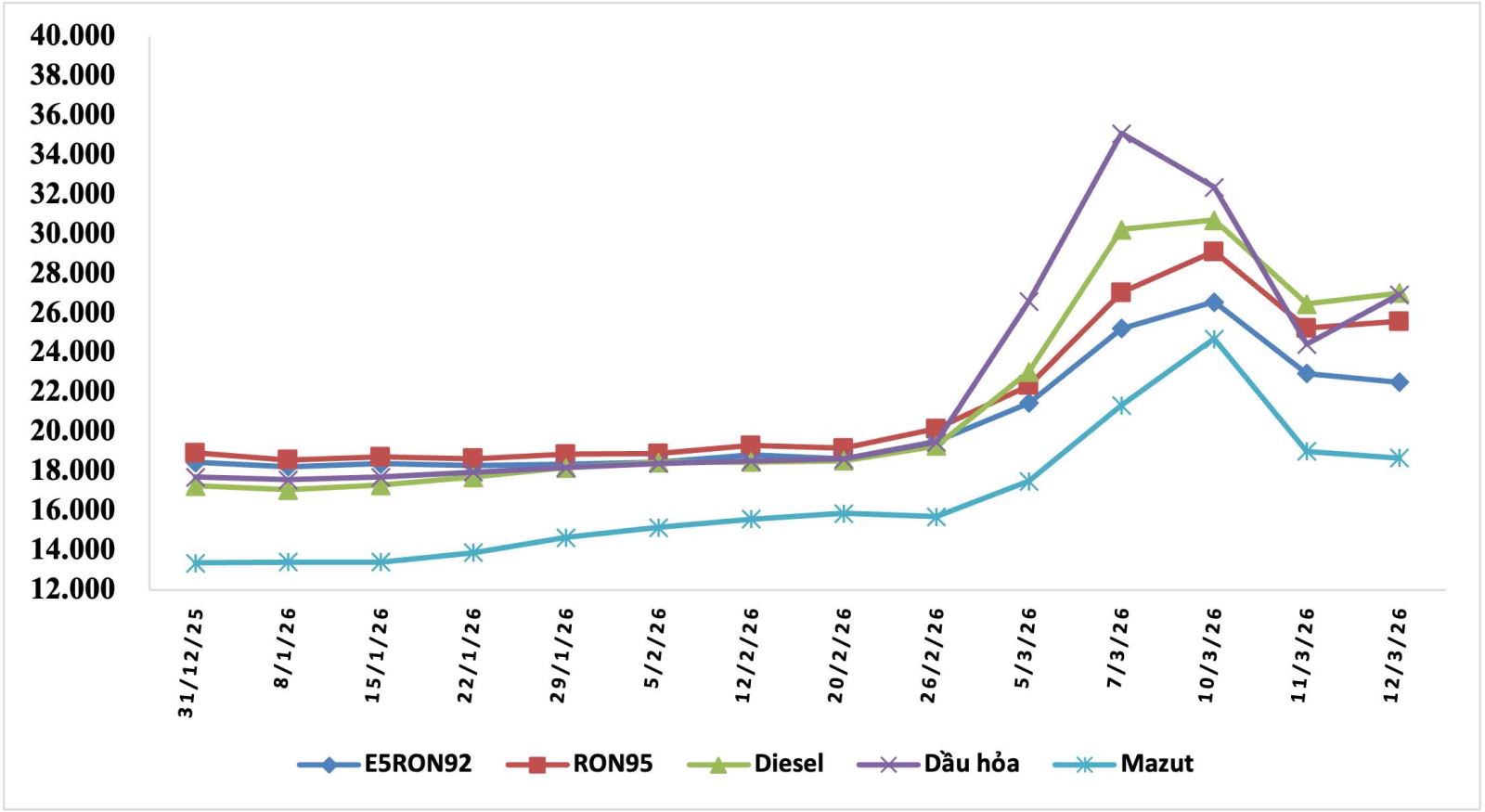 Biến động giá bán xăng dầu trong nước năm 2026 (31.12.2025 đến 12.3.2026). Nguồn số liệu: Bộ Công Thương