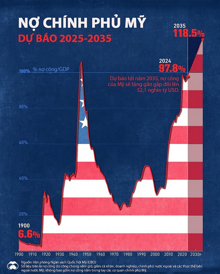 Tới năm 2035, chi phí trả lãi ròng cho các khoản nợ chính phủ được dự báo tăng lên gần 1,8 nghìn tỷ USD mỗi năm, tăng gần gấp đôi so với năm 2024... Đồ thị thông tin dưới đây thể hiện dự báo tỷ lệ nợ trên GDP của Chính phủ Mỹ từ năm 1900 đến nay và dự báo năm 2025-2035, dựa trên dữ liệu từ Văn phòng Ngân sách Quốc hội Mỹ (CBO).