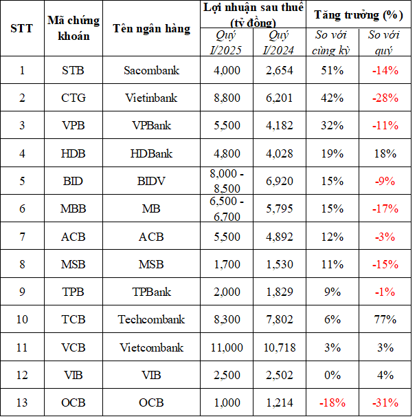 Theo dự báo của SSI Research, có 11 nhà băng sẽ ghi nhận lợi nhuận tăng trưởng dương so với cùng kỳ trong quý I/2025 và một ngân hàng lợi nhuận đi ngang (VIB) và một ngân hàng có lợi nhuận giảm (OCB). Tuy nhiên, so sánh với quý trước, có tới 9/13 ngân hàng tăng trưởng sụt giảm, chỉ có 4 nhà băng tăng trưởng khả quan, đó là: HDBank (18%); Techcombank (77%); Vietcombank (3%) và VIB (4%).
