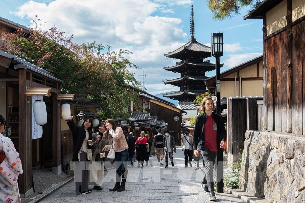 Du khách chụp ảnh trên con đường lát đá dành cho người đi bộ ở Kyoto, Nhật Bản. Ảnh: AFP/TTXVN