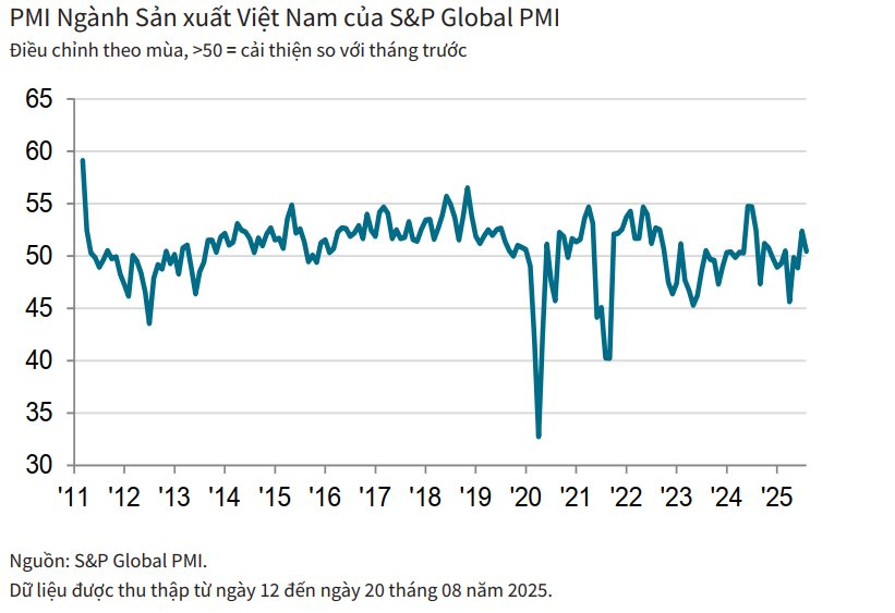 Theo đó, Chỉ số Nhà Quản trị Mua hàng PMI ngành Sản xuất Việt Nam vẫn nằm trên ngưỡng 50 điểm trong tháng 8, cho thấy sức khỏe ngành sản xuất cải thiện tháng thứ hai liên tiếp. Tuy nhiên, kết quả chỉ số PMI giảm từ 52,4 điểm của tháng 7 xuống còn 50,4 điểm cho thấy các điều kiện kinh doanh chỉ cải thiện nhẹ.