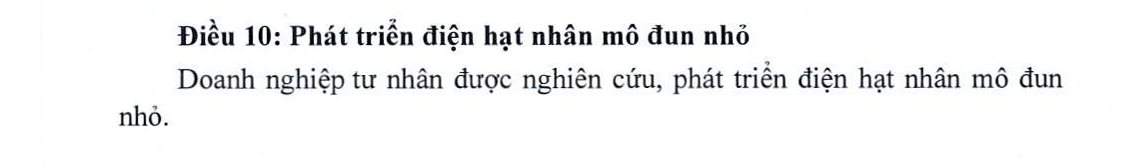 Trong dự thảo, điều 10 của chương III là doanh nghiệp tư nhân được nghiên cứu, phát triển điện hạt nhân module nhỏ.