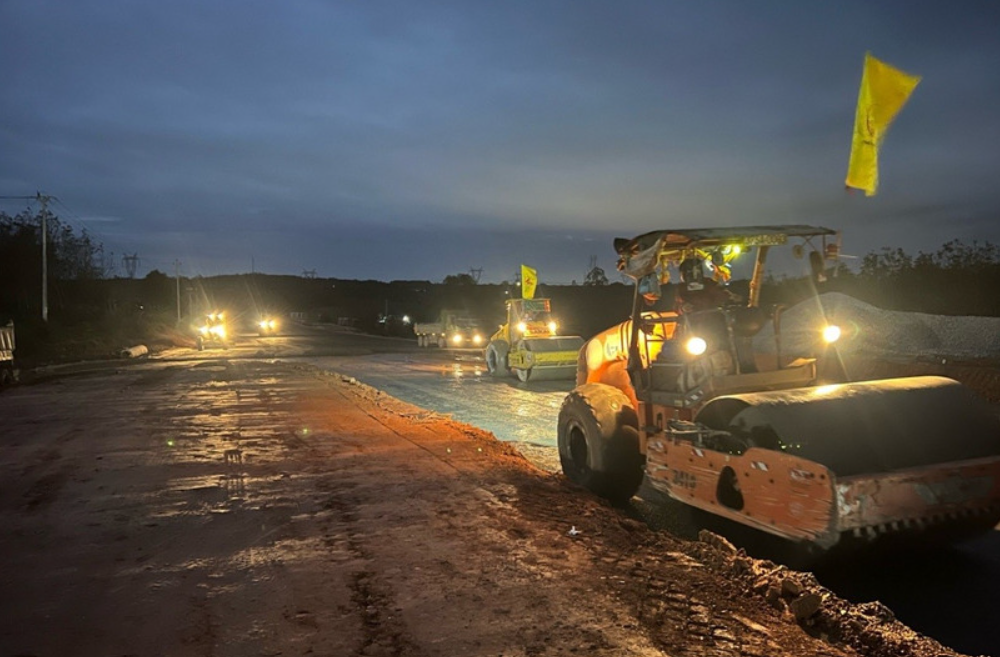 Nhà thầu thi công xuyên đêm tại công trường Dự án cao tốc Bắc-Nam phía Đông. (Ảnh: Việt Hùng/Vietnam+)