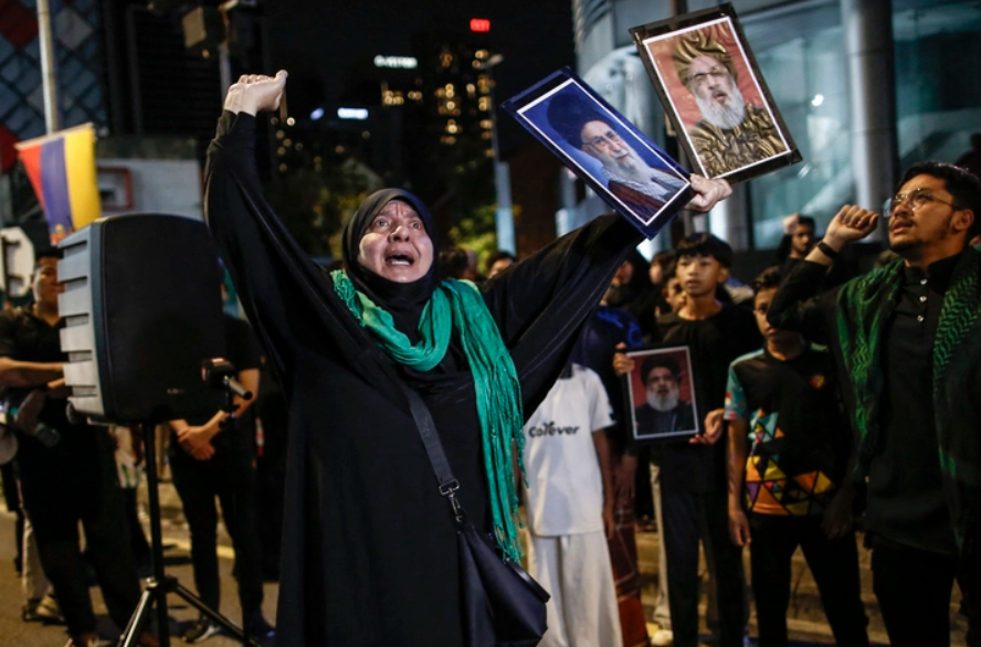 Một người phụ nữ theo đạo Hồi cầm ảnh ông Ali Khamenei đứng trước Đại sứ quán Mỹ ở Malaysia ngày 1-3 - Ảnh: AFP