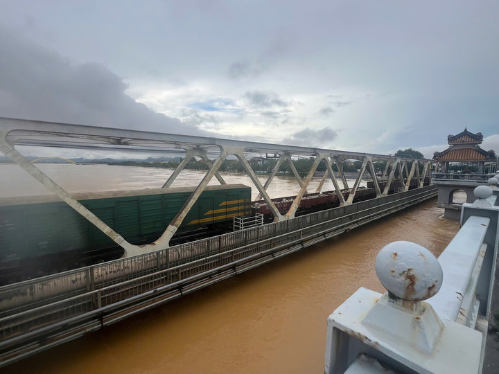 Nước lũ trên sông Hương dâng cao, ngành đường sắt phải điều hàng loạt tàu chở đá ra trấn giữ cầu Bạch Hổ và Dã Viên (Huế) để giữ ổn định cho cầu.