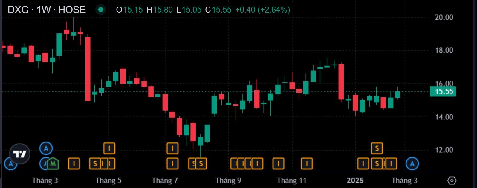 Trên thị trường chứng khoán, cổ phiếu DXG vừa chứng kiến nhịp giảm điểm từ cuối tháng 12/2024, đẩy thị giá của DXG từ trên ngưỡng 17.000 đồng/CP về dưới ngưỡng 14.500 đồng/CP vào trung tuần tháng 1/2025.