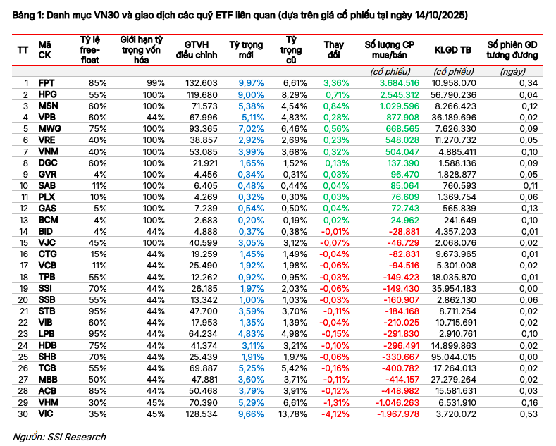 Dựa trên số liệu ước tính đến ngày 14/10/2025, SSI Research dự báo, đợt cơ cấu danh mục của chỉ số VN30 trong kỳ này sẽ có sự dịch chuyển đáng chú ý. Các cổ phiếu được mua ròng mạnh nhất gồm FPT với khoảng 3,6 triệu cổ phiếu, HPG khoảng 2,5 triệu cổ phiếu và MSN khoảng 1 triệu cổ phiếu. Ở chiều ngược lại, VIC và VHM là hai mã bị bán ra nhiều nhất, lần lượt khoảng 1,9 triệu và 1 triệu cổ phiếu.