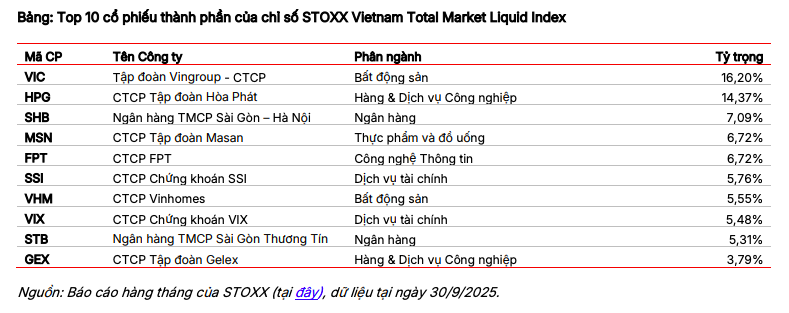 Cùng với đó, quỹ Xtrackers FTSE Vietnam Swap UCITS ETF cũng có sự thay đổi đáng chú ý khi chính thức chuyển sang mô phỏng chỉ số STOXX Vietnam Total Market Liquid Index kể từ ngày 14/10/2025. Theo SSI Research, đây là chỉ số phản ánh hiệu suất của thị trường chứng khoán Việt Nam, có tính đến yếu tố thanh khoản và tỷ lệ cổ phiếu còn lại mà nhà đầu tư nước ngoài được phép mua. Sau khi thay đổi chỉ số tham chiếu, quỹ cũng đổi tên thành Xtrackers Vietnam Swap UCITS ETF.