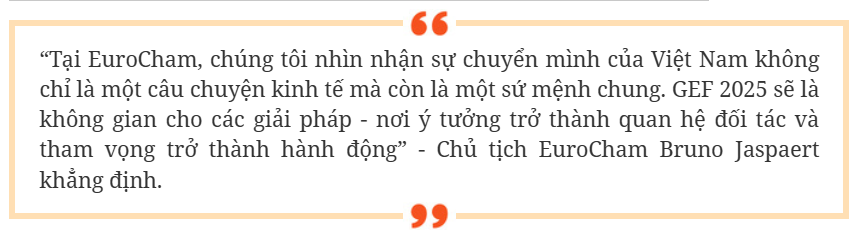 Thông tin rõ hơn về diễn đàn, ông Nguyễn Phan Đính - đồng Chủ tịch Ủy ban Tăng trưởng xanh của EuroCham nhấn mạnh: “GEF 2025 không chỉ là các khuôn khổ – mà còn là cách thức bền vững có thể được sống và áp dụng hàng ngày. Cho dù đó là giao thông sạch hơn, nhà ở hiệu quả hơn hay sản xuất thông minh hơn, mọi thảo luận tại đây đều liên quan trực tiếp đến cách thức vận hành của con người và doanh nghiệp”.