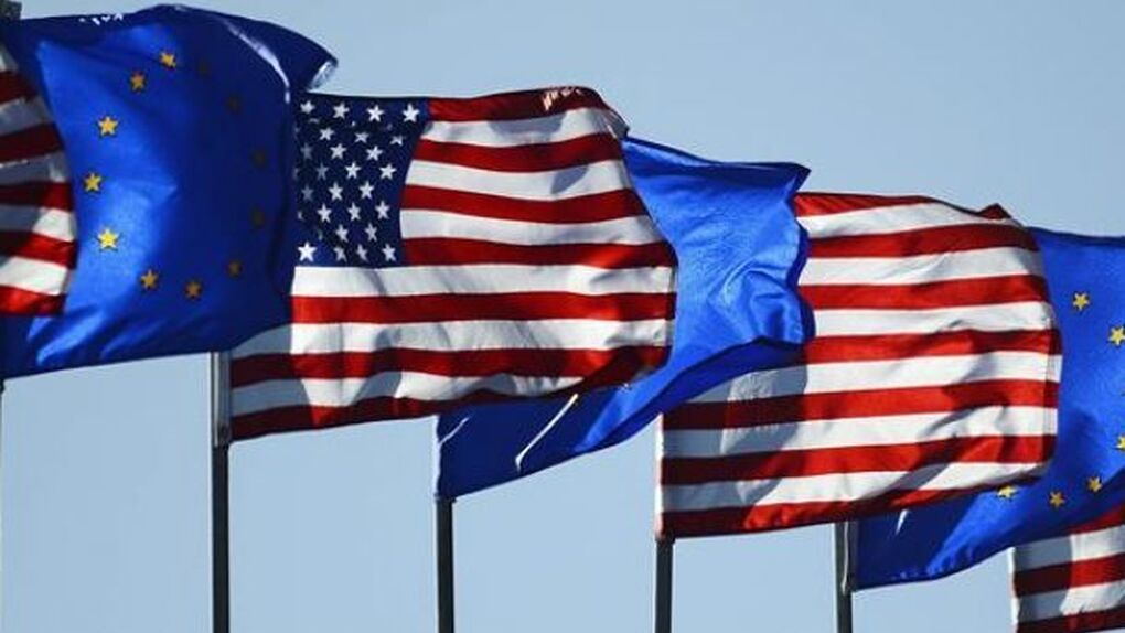 Cờ Mỹ và Liên minh châu Âu (EU). Ảnh: Getty