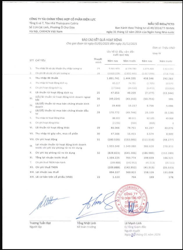 Công ty Tài chính Tổng hợp Cổ phần Điện lực (HoSE: EVF) vừa công bố báo cáo tài chính quý IV/2025. Theo đó, lợi nhuận trước thuế quý IV đạt 199,6 tỷ đồng, tăng 20% so với cùng kỳ năm 2024.
