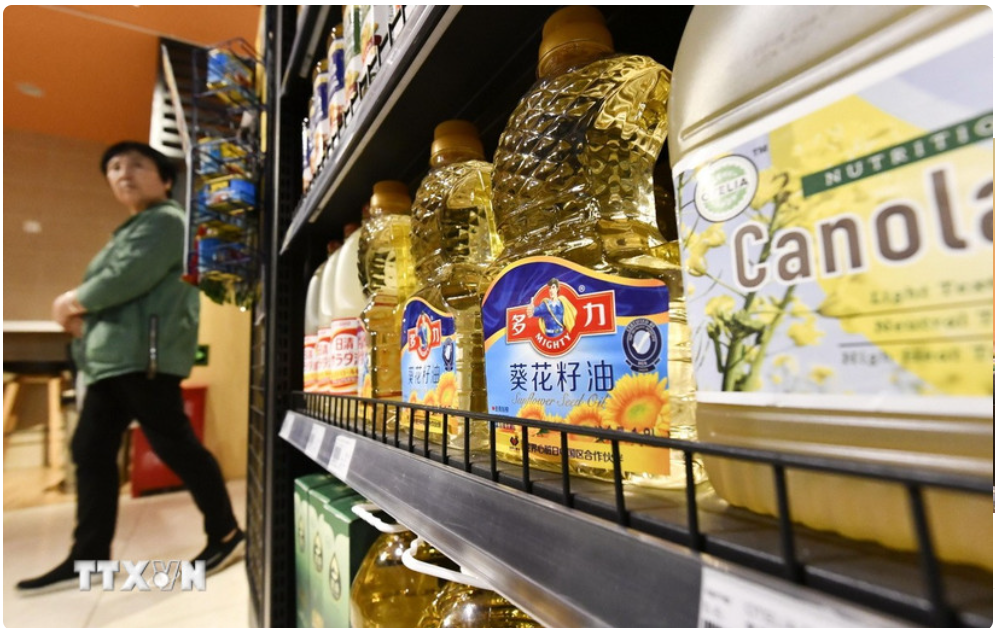 Dầu ăn được bày bán tại cửa hàng ở Bắc Kinh, Trung Quốc. (Ảnh: Kyodo/TTXVN)