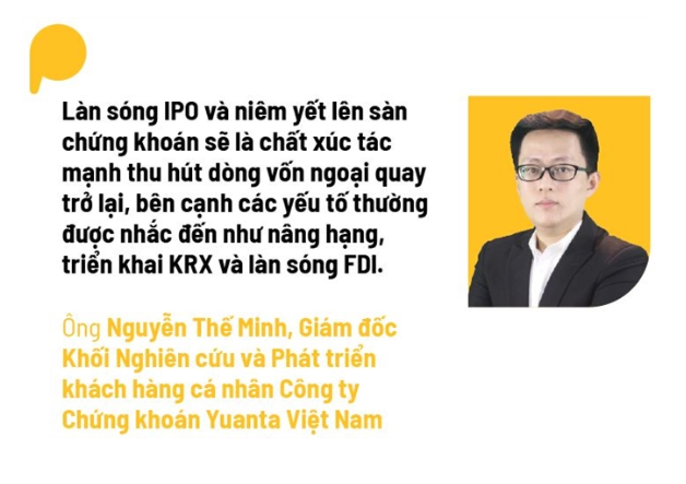 Trong khi đó, ông Nguyễn Thế Minh, Giám đốc Khối Nghiên cứu và Phát triển khách hàng cá nhân Công ty Chứng khoán Yuanta Việt Nam, cho rằng làn sóng IPO và niêm yết lên sàn chứng khoán sẽ là chất xúc tác mạnh thu hút dòng vốn ngoại quay trở lại, bên cạnh các yếu tố thường được nhắc đến như nâng hạng, triển khai KRX và làn sóng FDI.
