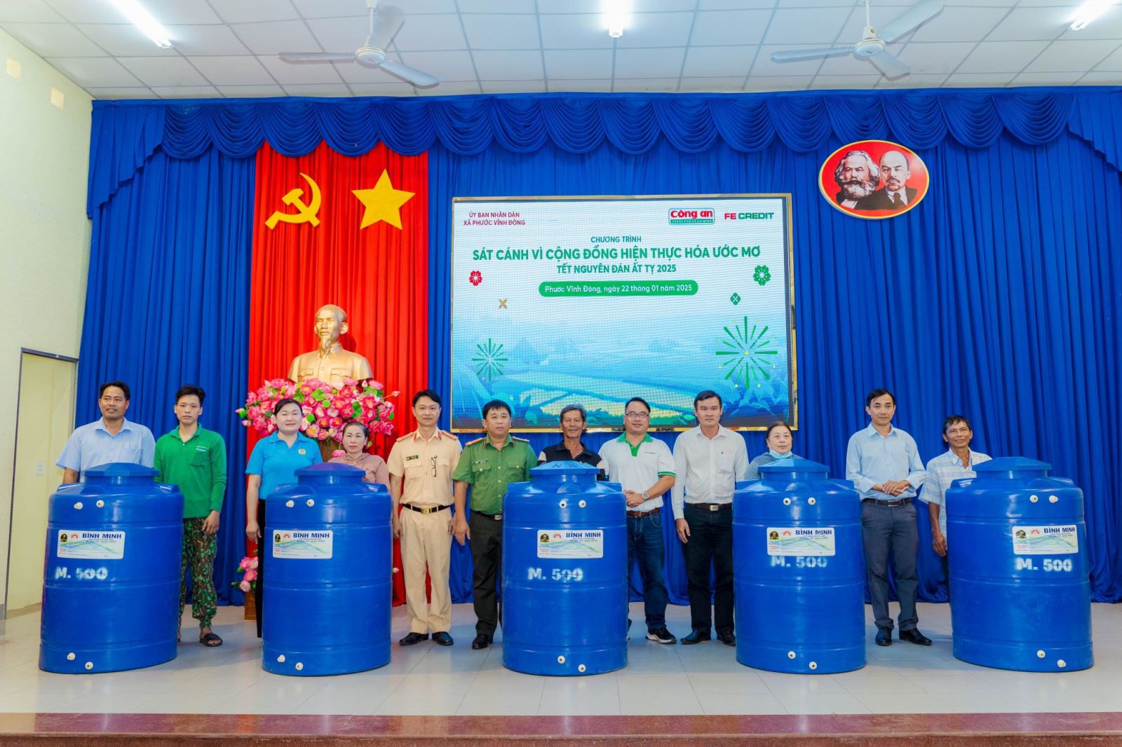 Chương trình trao tặng 50 phần quà Tết và 50 bồn chứa nước cho các hộ gia đình chính sách khó khăn tại xã Phước Vĩnh Đông, huyện Cần Giuộc, tỉnh Long An, nhằm mang lại niềm vui và sự hỗ trợ thiết thực cho người dân địa phương. Đây là hoạt động nằm trong khuôn khổ chương trình “Sát cánh vì cộng đồng, hiện thực hóa ước mơ” mà FE CREDIT đã triển khai xuyên suốt năm 2024.