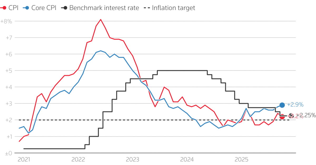 BoC đã giữ nguyên lãi suất chủ chốt ở mức 2,25% vào thứ Tư (10/12), sau khi giảm 225 điểm cơ bản trong chu kỳ này. Thống đốc BoC Tiff Macklem cho biết, nền kinh tế Canada đang chứng tỏ khả năng phục hồi trước các biện pháp thương mại của Mỹ.