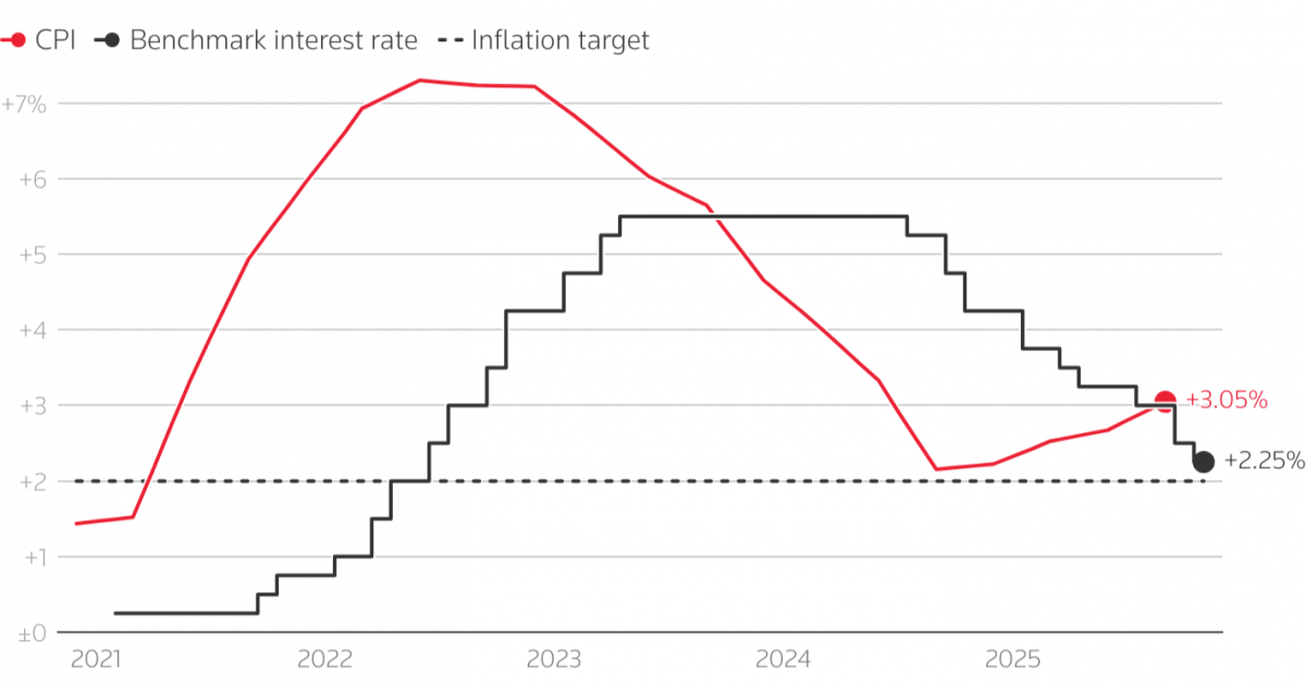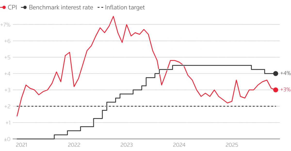 Tháng trước, BOE đã bỏ phiếu với tỷ lệ 5-4 để giữ nguyên lãi suất ở mức 4% và vẫn đang chia rẽ sâu sắc sau khi ngân sách của chính phủ được công bố ngày 26/11 đã làm xấu đi tâm lý kinh tế, nhưng lạm phát giá thực phẩm tăng cao cho thấy áp lực giá cả vẫn còn mạnh.