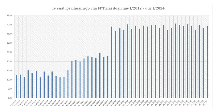 Sự bền bỉ của FPT còn được thể hiện ở việc duy trì ổn định biên lợi nhuận gộp. Cụ thể, kể từ sau khi bỏ sáp nhập FPT Retail, biên lợi nhuận gộp của FPT tăng vọt vào quý I/2018 và thường duy trì ổn định trong khoảng 35 - 40%.