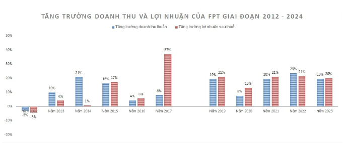 Tuy nhiên, từ sau khi bỏ sáp nhập FPT Retail, tăng trưởng doanh thu và lợi nhuận rất ổn định. Không kể năm 2018 - năm so sánh tăng trưởng không có nhiều ý nghĩa do chịu ảnh hưởng từ số liệu trước khi bỏ sáp nhập và sau khi bỏ sáp nhập FPT Retail, từ năm 2019 đến năm 2023, tăng trưởng doanh thu và lợi nhuận của FPT duy trì quanh mốc 20%, ngoại trừ năm 2020 chịu ảnh hưởng bởi dịch Covid-19 (lợi nhuận vẫn tăng hai chữ số). Trong quý I/2024, tăng trưởng doanh thu và lợi nhuận của FPT so với cùng kỳ năm trước đó tiếp tục giữ ở quanh mốc 20%.